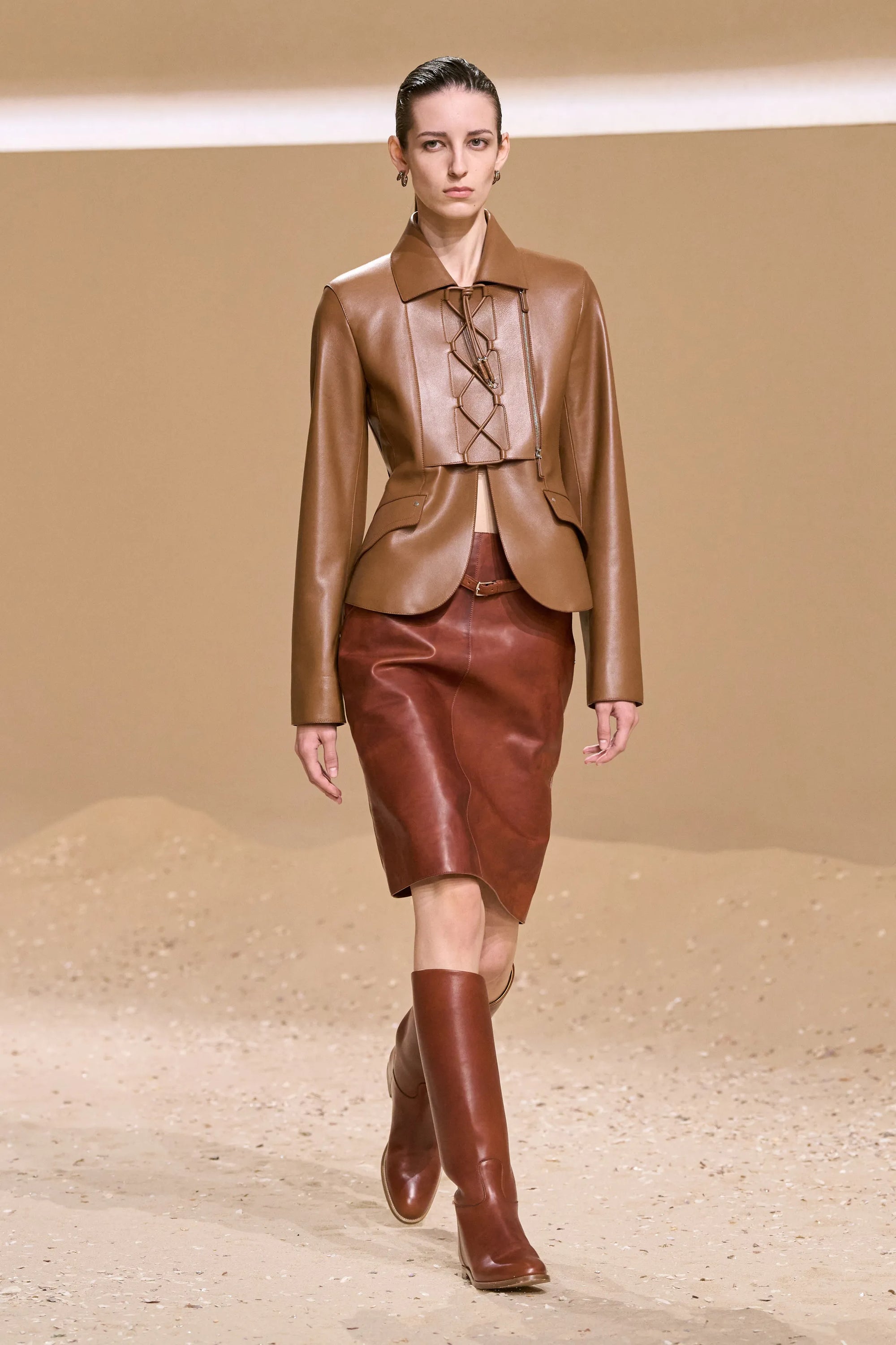 The show unfolded on a sand-covered runway, a poetic nod to the riding arenas of the Camargue, where white horses run wild between the Rhône and the Mediterranean. The terrain grounded each look, the models’ boots pressing softly into the sand, echoing hoofprints and discipline, nature and control.